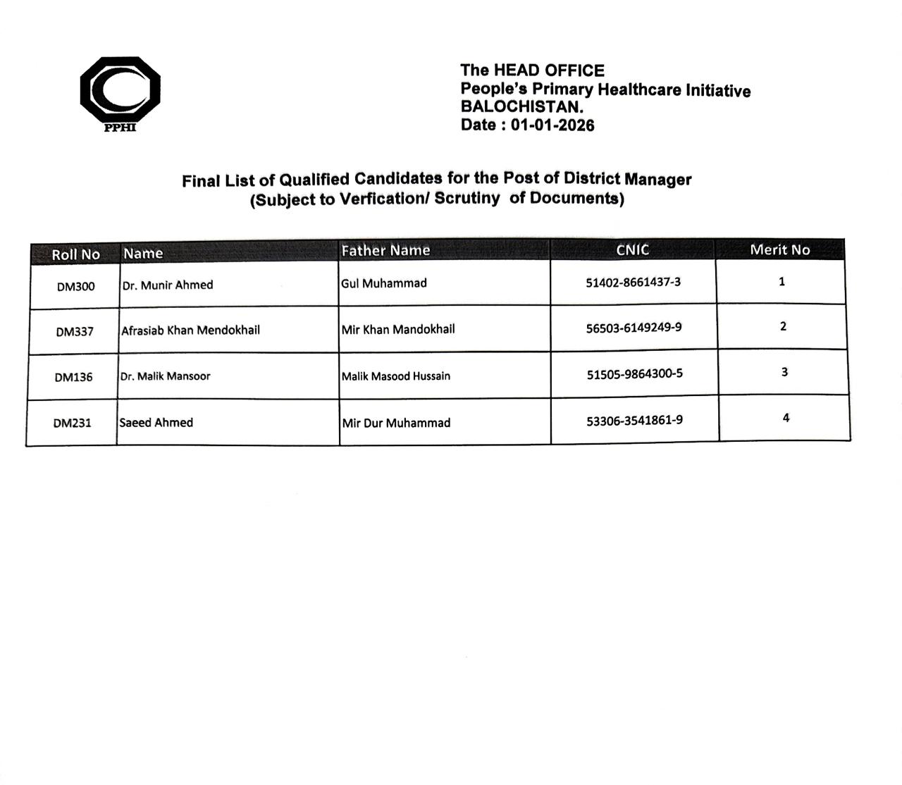| Qualified Candidates DM | List of candidates qualified for the post of District Manager PPHI Balochistan. 2026-01-02 |