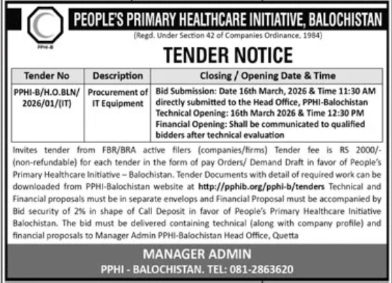 | Tender Documents BHU Habib Killa | Sealed proposals are invited under the Peoples Primary Healthcare Initiative (PPHI-Balochistan) for Civil Works BHU Habib Killa District Dukki 2025-07-29 Closed |